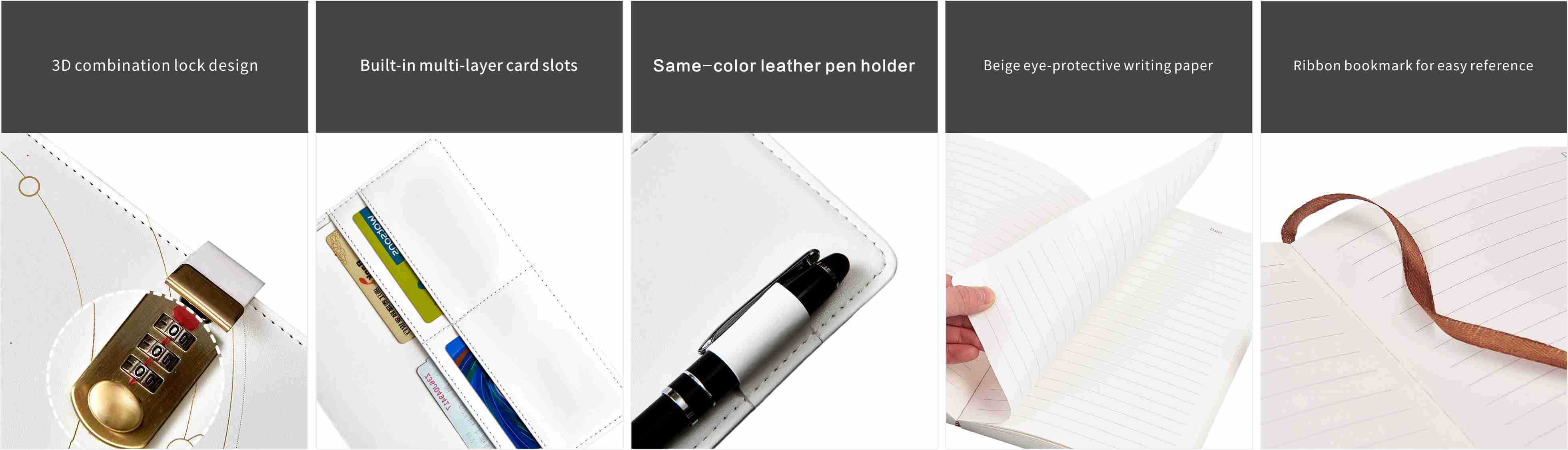 책 옆면에 펜 꽂이가 있어서 매일 사용하기 편리합니다. 녹음이 필요할 때는 펜을 들고 부담 없이 쓸 수 있습니다. 노트북에는 카드를 보관하는 데 사용할 수 있는 내장 포켓이 장착되어 있으며 카드(예: ID 카드 또는 은행 카드), 임시 메모 또는 작은 필수 항목을 보관하는 데 매우 적합하여 일기장을 휴대하기 쉬운 다기능 정리 도구로 만듭니다.