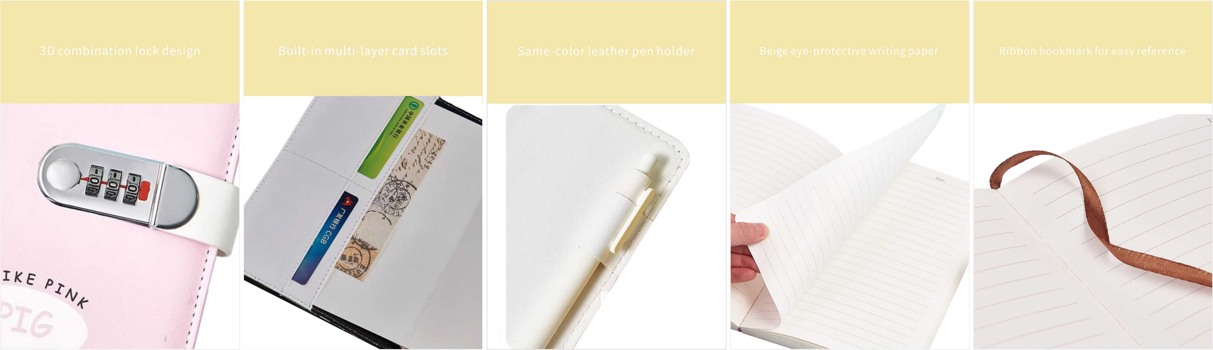 암호 잠금 장치가있는이 일기는 다양한 귀여운 커버 패턴을 제공합니다. 어떤 스타일을 좋아하든 여기서 가장 좋아하는 선택을 찾을 수 있습니다. 또한 견고하고 내구성있는 금속 암호 잠금 장치가 장착되어 있습니다. 고유 한 비밀번호를 직접 설정하여 개인 정보를 열고 내부 페이지를 읽을 수 있도록하여 개인 정보 및 중요한 정보를 안정적인 보호 기능을 제공 할 수 있습니다. 언제든지 아이디어를 녹음하는 것이 편리하기 위해 우리의 일기는 또한 펜 위치를 신중하게 설정합니다. 펜을 꾸준히 고정시킬 수 있으므로 필요할 때 언제든지 펜 레코드를 찍을 수 있습니다. 또 다른 두드러진 특징은 내부 백 기능입니다. 암호 잠금 장치가있는이 일기에는 여러 카드 소켓과 내부 포켓이 장착되어있어 은행 카드, ID 카드, 멤버십 카드, 영수증 및 기타 품목을 깔끔하게 저장할 수 있으며 더 이상 이러한 중요한 품목을 잃는 것에 대해 걱정할 필요가 없습니다.